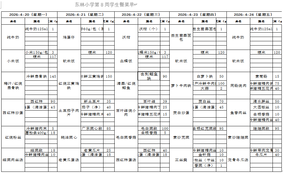 2026.4.20东林小学第8周学生餐菜单