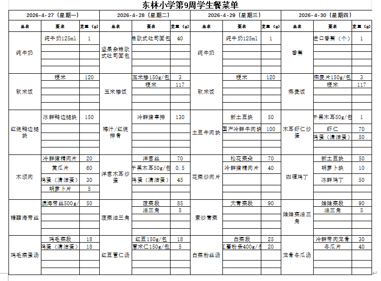 2026.4.27东林小学第9周学生餐菜单